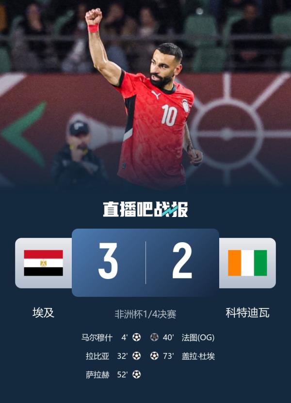 1月11日讯 非洲杯1/4决赛,埃及3-2击败科特迪瓦,晋级四强。